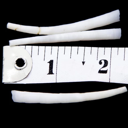 Dentalium are small tusk shaped univalve mollusks. These little shells were used for adornment as well as money amongst Pacific coastal tribes. Most Dentalium available in today’s bead and jewelry market is imported from Asia. This Asian Dentalium is more brittle than the Dentalium originally used by Native tribes.