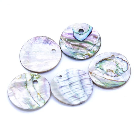 Natural Red Abalone Farmed in California, cut and finished in The Philippines. These Abalone coins have a pale coloring with pinks, greys, and greeny-blues.Â