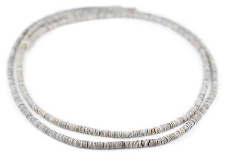 These grey heishi beads are made from natural shell. The slight variations in colors and shape of the beads will make them a fun addition to your beading project. Look carefully and you will see that each bead is unique. Individual beads measure 1 x 5mm with a hole size of approximately 1mm
