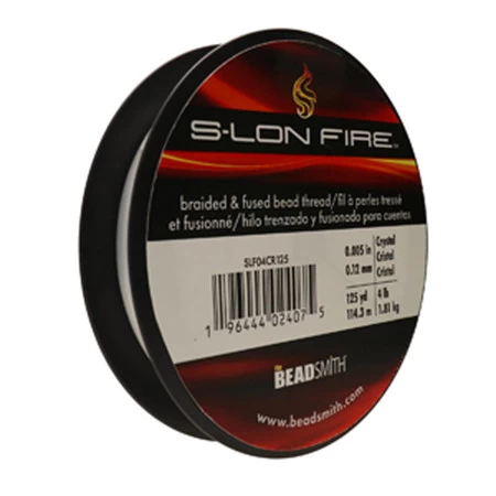 S-LON FIRE is a microfused braided bead thread – a budget friendly alternative to FireLine . Durable, strong, stretch resistant, and knots easily. Fits your beading needle sizes #10, #12, and #13, Use instead of nylon threads when weaving sharp edged beads such as crystals and bugle beads.